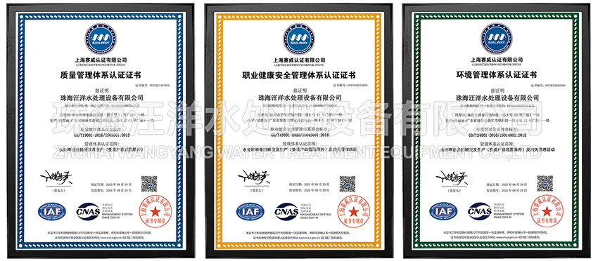 公司是国家认定高新技术企业,注册资金1100万元,厂房占地面积2000余平米,凭借严格的质量管理已获得ISO9001:2015质量管理体系认证、ISO14001:2015环境管理体系认证、ISO45001:2018职业健康安全管理体系认证,船级社检验证书,水处理专利15项,高新技术产品4项,软件著作权2项。