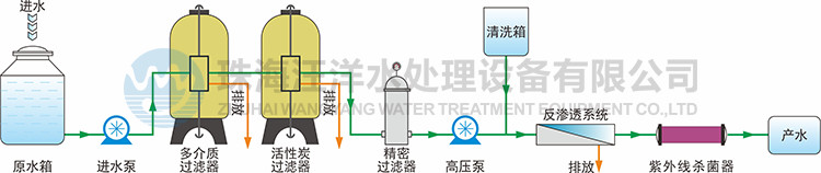 进水 → 多介质过滤器 → 活性炭过滤器 → 精密过滤器 → 高压泵 → 反渗透系统 → 产水