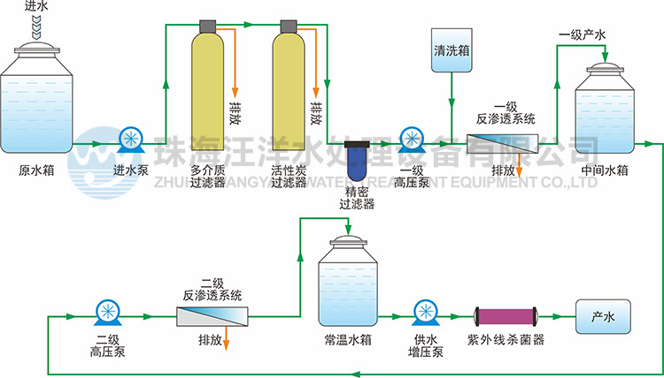 进水 → 多介质过滤器 → 活性炭过滤器 → 精密过滤器 → 一级反渗透系统 → 二级反渗透系统 → 产水