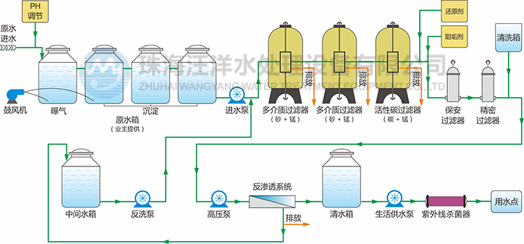 1. 低压停机保护,当预处理供水不足引起高压泵进水压力低于0.05MPa时,会自动停机保护动作并发出声光报警。 2. 预处理配有自动控制多路阀,石英砂+锰砂过滤器与活性炭+锰砂过滤器在一定压力差下进行自动清洗。 3. 配置反渗透膜清洗系统,可对反渗透膜组件进行物理清洗、化学清洗和加注保护液。 4. 配套紫外线杀菌器,保证水质。 |